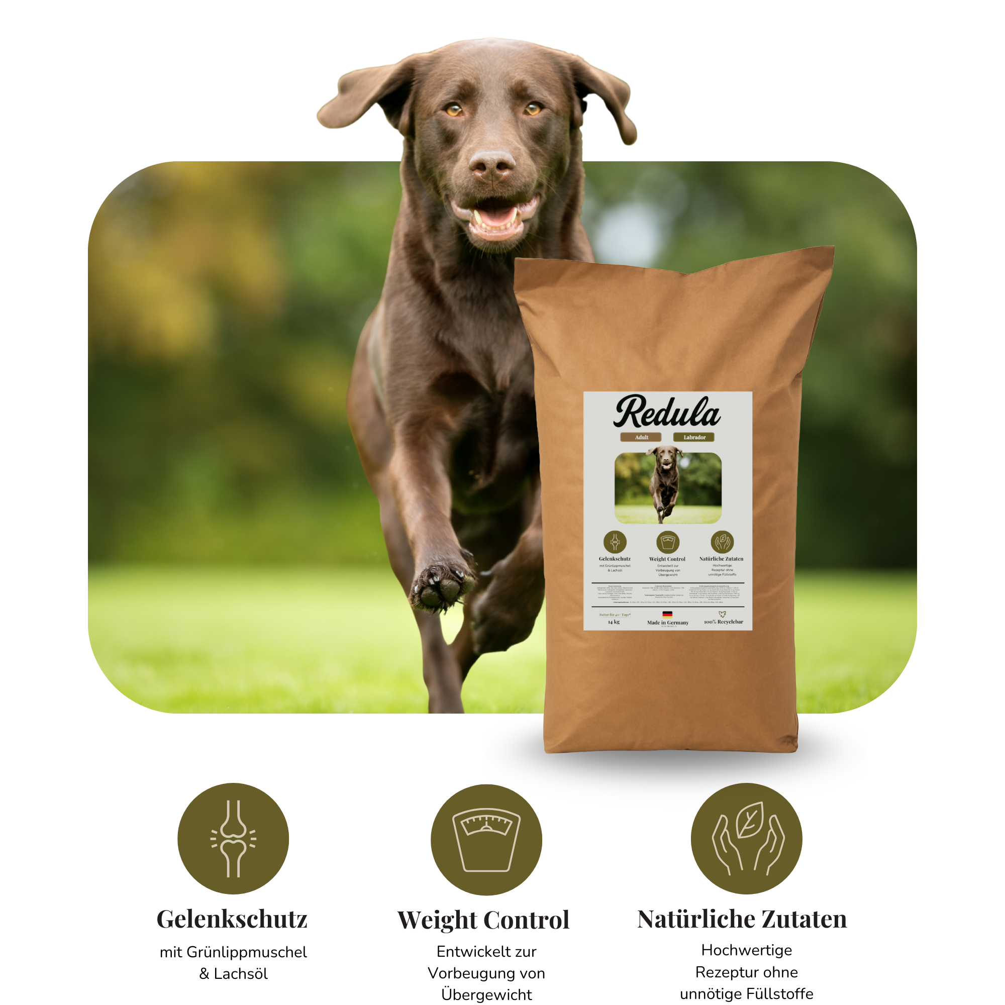 Labradore lieben Futter – oft ein bisschen zu sehr. Genau deshalb haben wir Redula entwickelt: ein vollwertiges Alleinfuttermittel, das deinem Hund alles gibt, was er braucht – und nichts, was ihn belastet.